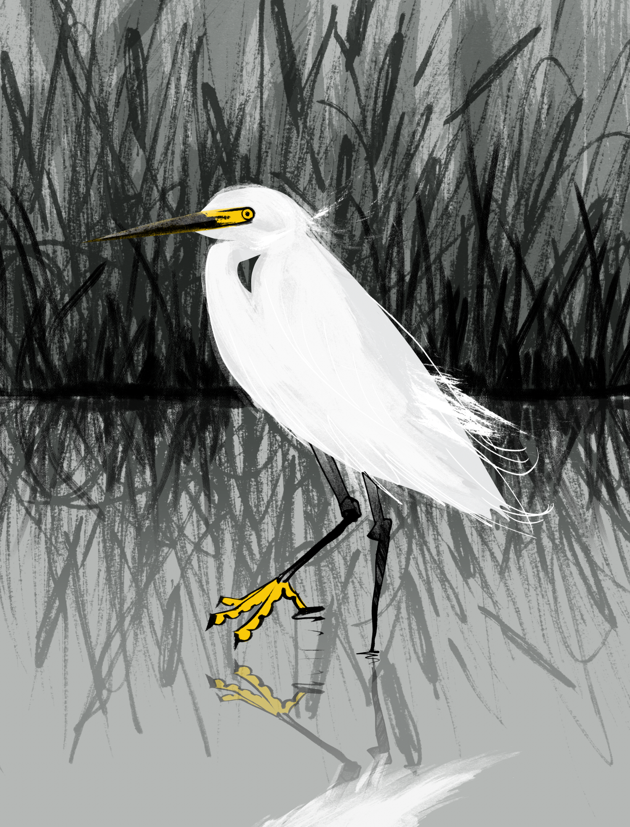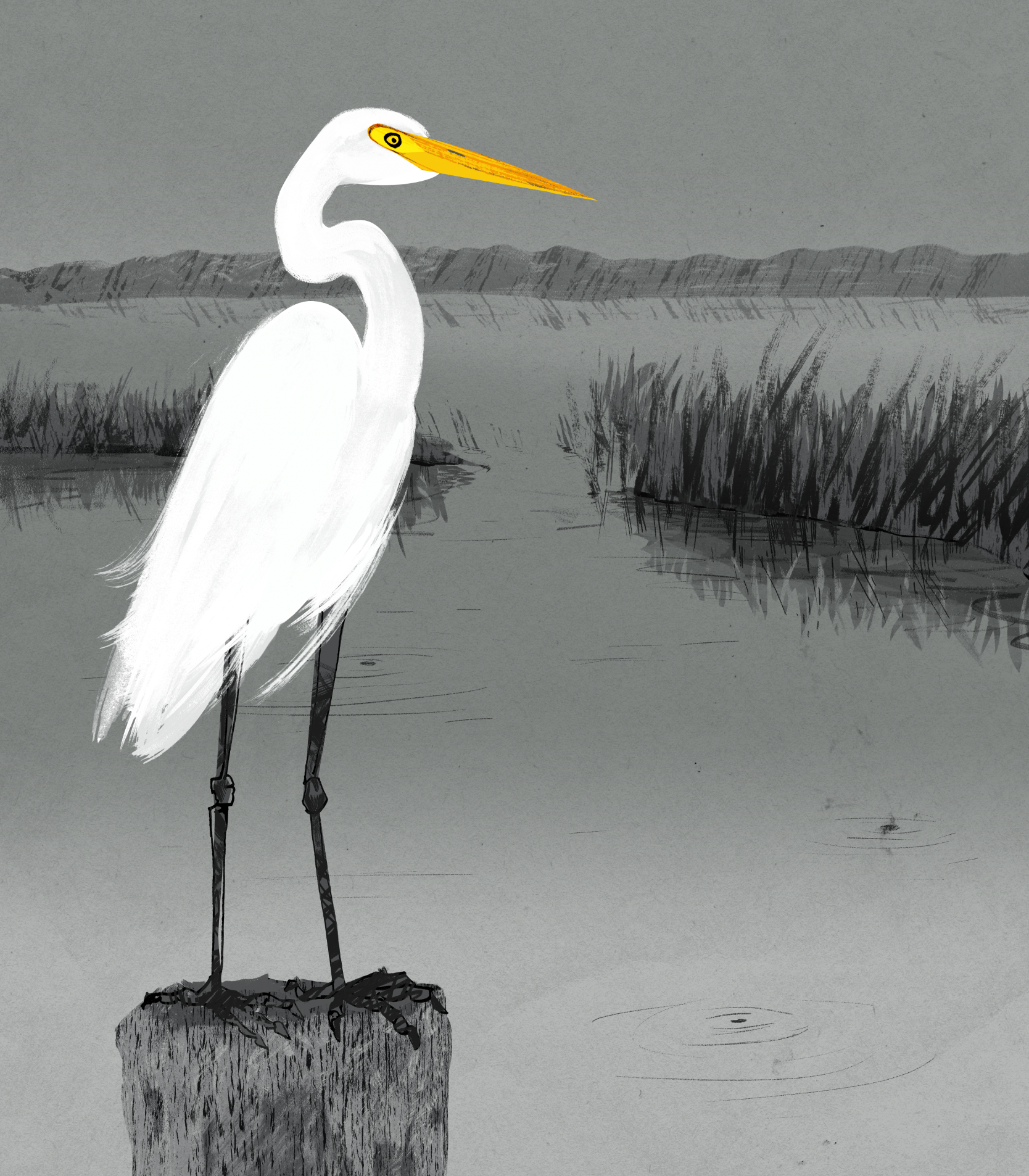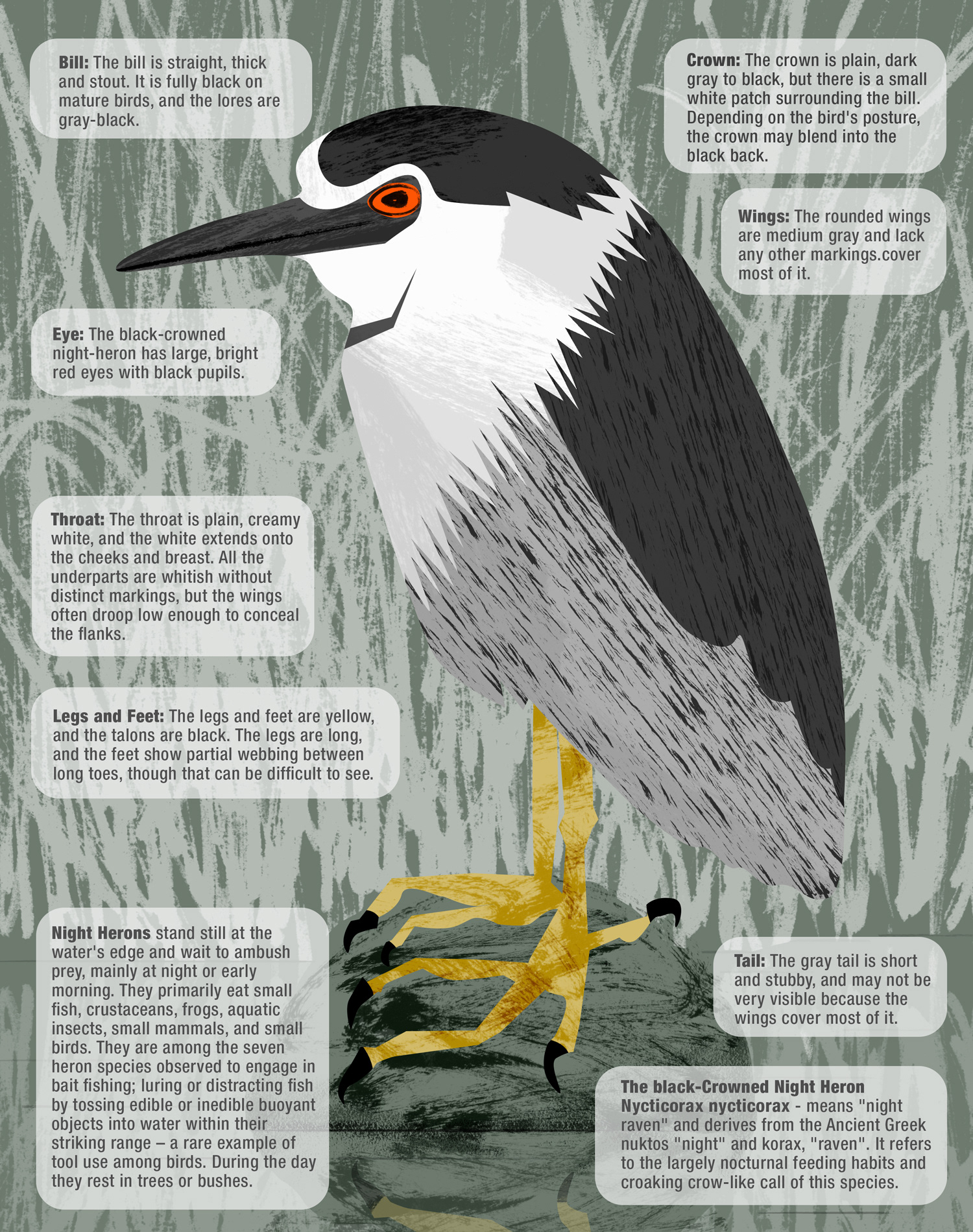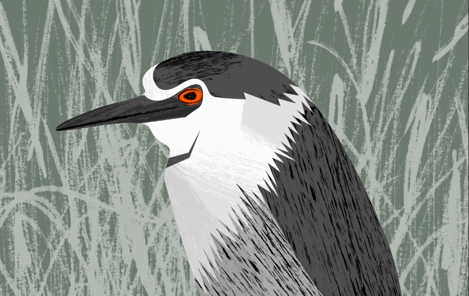 Series of illustrations for an interpretive design brochure and a poster explaining differences between various species of egrets and herons that can be found in the local park.